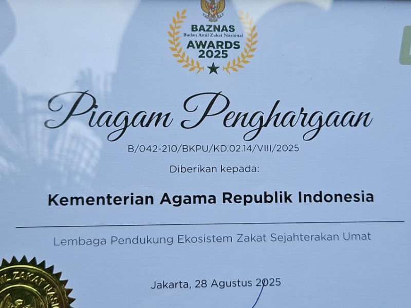 Jakarta (Kemenag) — Kementerian Agama didaulat sebagai Lembaga Pendukung Ekosistem Zakat Sejahterakan Umat. Penghargaan ini diberikan oleh Badan Amil Zakat Nasional (Baznas) pada Baznas Award 2025.