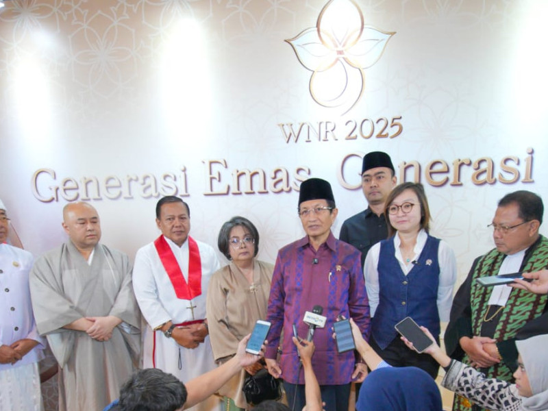 Menag menyampaikan keterangan pers usai menghadiri doa bersama yang diikuti ribuan peserta, Jumat (26/9/2025)